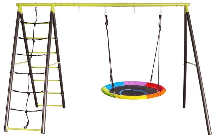 A kerettel, létrával, mászóhálóval és hintagyűrűvel rendelkező készlethez vásárolhat hintát kisgyermekeknek, hintát nagyobb gyerekeknek, vagy egyszerűen csatlakoztathatja az opcionális G21 csúszdát a harmadik A-rugóhoz, és létrehozhat egy hintát. nagyszerű kerti játszótér gyerekeknek.