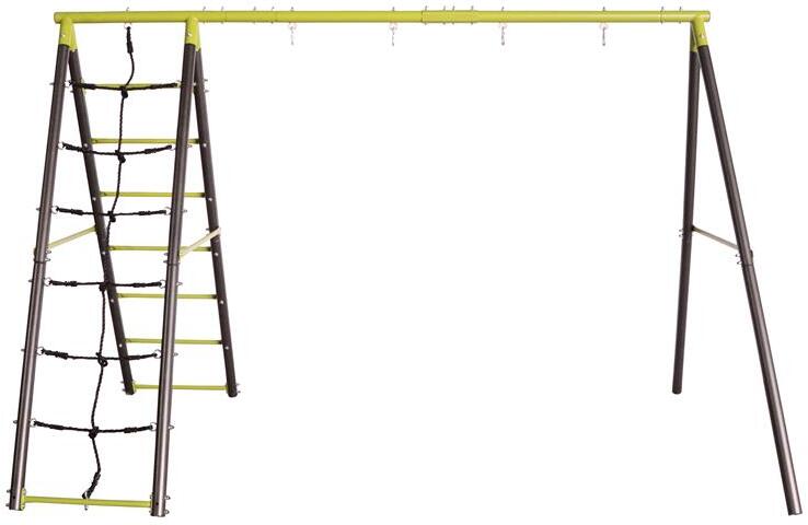 A fém fűzőlyukaknak köszönhetően könnyen felakaszthatsz rá hintákat kisgyermekeknek vagy hintaköröket. A két oldalsó támasz között egy létra és mászóháló található PE műanyagból, a harmadik támaszpár pedig készen áll egy csúszda rögzítésére. Biztonsági okokból a kerti hinta szerkezetét a talajhoz kell rögzíteni. A csomag ezért rögzítőhorgokat és a helyes és biztonságos rögzítéshez szükséges utasításokat is tartalmaz.