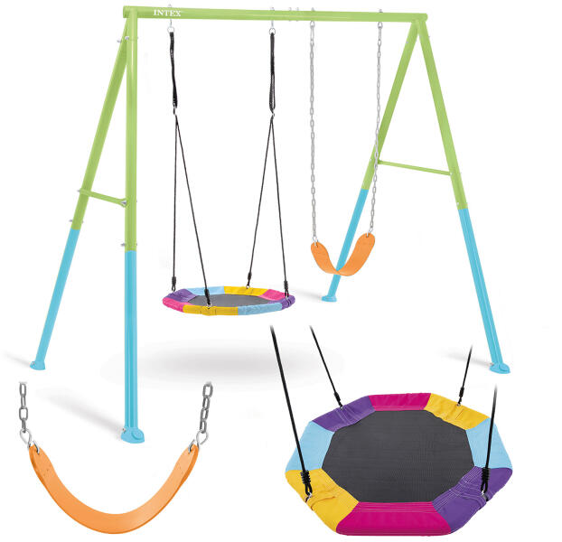 Az új hinták 6 cm átmérőjű horganyzott acélcsövek kapacitását használják ki a nagyobb teherbírás és szerkezeti stabilitás érdekében. A gyerekek el lesznek ragadtatva ettől a hintától. Az Intex úgy tervezte, hogy hangsúlyt fektetett a minőségre és a biztonságra. A speciális rögzítő kampók, amelyek a hintát a talajhoz rögzítik, garantálják a stabilitást és a biztonságot. Játék 3-10 éves gyerekek számára. A "Gólyafészek" 50 kg alatti gyerekek számára használható. A "Gólyafészek" hintán a maximális gyereklétszám 2 fő. Az egyik, rugalmasságot biztosító láncos ülésen 1 fő helyezkedhet el, maximális súly 50 kg.