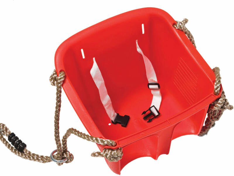 Így a kisgyermekek is megtapasztalhatják a hintázás élményét. Fröccsöntött műanyagból készült, piros színű, csatos biztonsági övvel és T-alakú kiesésgátlóval ellátott beülős bölcsőhinta. A gyűrűk és a kampók horganyzott acélból, a hegesztések a kötélen fekete PP-ből készülnek.
