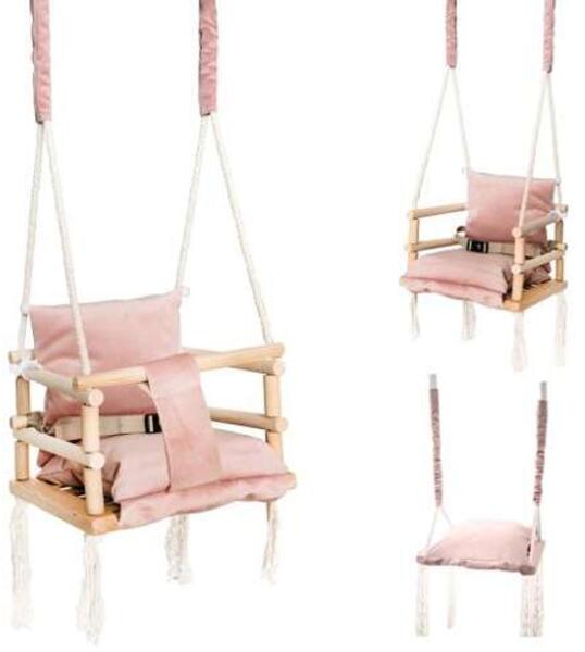 A párna és a hintaállvány finom, bársonyos-plüss Cleanaboo anyagból készült. Ez az anyag nem szívja fel a vizet, a kiömlött folyadék cseppekké képződik, ami nagy előny a gyermek számára. A hinta minden apró részletre odafigyelve készült.  Alkalmas 8 hónapos kortól (a gyermek maximális súlya 30 kg). Anyaga puha, kellemes tapintású. Teljesen biztonságos a gyermek számára, a szélei lekerekítettek és az egész precízen polírozott. Lehetőség van a hinta anyagrészeinek eltávolítására, így könnyedén gondoskodhat a higiéniájáról. LEÍRÁS: